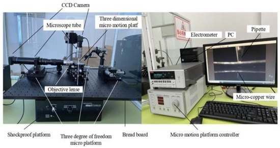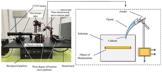 The above micro-operation methods are all designed for grippers to achieve micro-object manipulation of a single shape. There are more requirements for operation space, operation object shape and size, and it is difficult to really apply to industrialization. Considering the above results, our group proposed a micrometer-scale metal manipulation method based on electrochemical principles [16]. This manipulation method is not a single design for the end gripper compared with the traditional micromanipulation method. This uses the deposition and electrolysis principles in electrochemistry to manipulate micron-sized metals of different sizes with high operational efficiency and no pollution to the environment, which can be widely used in the production and processing of microelectromechanical systems. It is an important contribution to accelerate the development of micro- and nanoscale industries. The metal microcopper wire is used as the manipulating objects and is placed on a metal substrate made of conductive silicon. The electrolyte used in the experiments is a dilute copper sulfate solution, and the pipette is made of quartz glass. The micromotion control stage is connected to a quartz pipette containing an electrolyte, and the pipette is controlled by manipulating the micromotion stage. The microcopper wire is located on the surface of the silicon substrate. The micromanipulation platform has a microscope tube, and a digital camera is mounted on top of the microscope. During the experimental manipulation, the experimental process is transmitted to the monitor through the microscopic vision system to view the micromanipulation process in real-time. The overall experimental platform and partial amplification are shown in Figure 1.