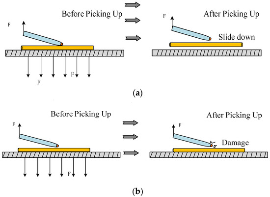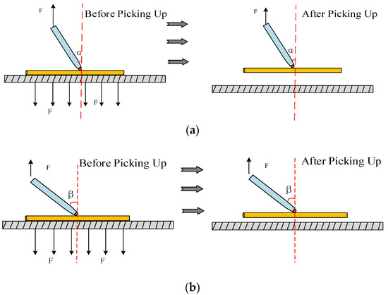 Schematic diagram of successful manipulation of different manipulation points. (a) Pick when the pipette tilt angle is α; (b) pick when the pipette tilt angle is β.