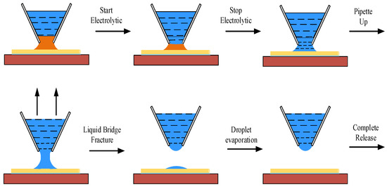 Since the volume of deposited copper depends on the shape formed by the liquid bridge, when the manipulation angle is selected between 0 degrees and 90 degrees, the cross-sectional area of deposited copper meets the manipulation requirements. The method can meet the stress and strain requirements of the target micro-object. In the electrolysis process, the deposited copper is converted into the electrolyte in a shorter time because the overall volume of the deposition is reduced. When the deposition meets the complete electrolysis from the pipette nozzle to the bottom of the deposition, the expected effect of accurate and nondestructive release is achieved by applying an upward force to the manipulation tool. The electrolyte adhering to the surface of the micro-object evaporates and diffuses into the air at room temperature without causing any pollution to the environment. The release manipulation process is shown in Figure 4.