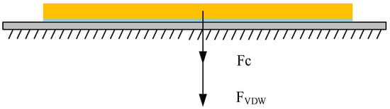 There is a certain distance between the microcopper wire and the substrate, which is far less than the radius of the microcopper wire. There is a van der Waals force between the microcopper wire and the substrate, which shows that the two objects attract each other, which also affects the pick-up process. Therefore, we needed to calculate the magnitude of these forces before manipulation. After calculation, there was a big difference between the mass of the microcopper wire and the van der Waals force between the microcopper wire and the substrate. Therefore, the gravity of the microcopper wire was ignored in the subsequent calculation. The force model of the microcopper wire on the substrate is shown in Figure 7.