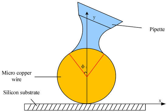 From the force model, we can understand that once the microcopper wire is at rest, it is subjected to gravity, van der Waals forces [17,18] and capillary forces [19,20,21]. According to Equation (1), the capillary force FC between the microcopper wire and the silicon substrate can be calculated; Equation (2) can calculate the van der Waals force FVDW between the microcopper wire and the silicon substrate; Equation (3) can calculate the gravitational force FG of the microcopper wire. The force relationships to be satisfied during the pick-up manipulation are shown in Equations (4) and (5). The meaning of each variable in Equations (1)–(5) is detailed in [22].