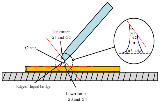 where α1 and α2 are the upper and lower contact angles between the liquid bridge and the pipette and the liquid bridge and the microcopper wire. Figure 8 is a side view of the liquid bridge deposition model. Figure 9 shows the front view of the liquid bridge deposition model (in the case of an oblique angle of 45°). α1 is the filled angle of the microcopper wire in the liquid bridge.