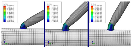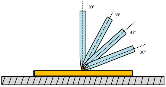 In the simulation, a pipette filled with an electrolyte was used to manipulate the microcopper wire with a diameter of 60 μm and a length of 300 μm. Based on the study mentioned above the of pipette and microcopper wire sandwich angle of 90°, we selected the pipette manipulation point at the center point of the microcopper wire, the stress condition of deposited copper and the model change of sedimentation when the pipette and microcopper wire angle was 30°, 45° and 60°. Because the evolution of the contact angle would cause the corresponding modifications in capillary force, liquid bridge volume, and shape, this paper combined its calculations with Young–Laplace square according to Kelvin thermodynamics. By modeling the liquid bridge at different contact angles by combining the calculation of the elliptic integral equation, Figure 10 shows the manipulation contact diagram of different picking angles.