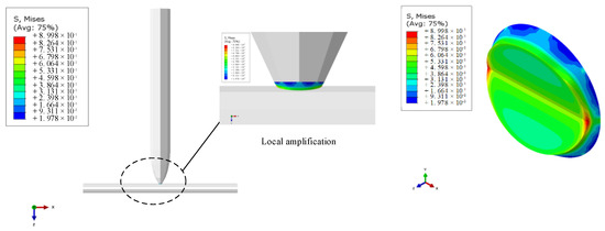 From Figure 12, it can be concluded that the electrolyte in the pipetting tube chemically produced a connection between the deposited metal copper, pipetting pipet and the microcopper wire. At this time, the pipetting tube and micrometal copper wire became one whole, through the pipetting tube at one end of the application of load force to overcome the microcopper wire and the base between the van der Waals force and capillary force and its gravity, to achieve a fast and stable pick-up effect. Using simulation software to stress the analysis and simulation of the deposited metal copper and the local amplified stress diagram obtained by defining the load and boundary constraints, we created the simulations shown in Figure 13. After the electrolyte deposition, the stress value in the connection bending of the pipette nozzle is at its maximum during the micromanipulation picking-up process.