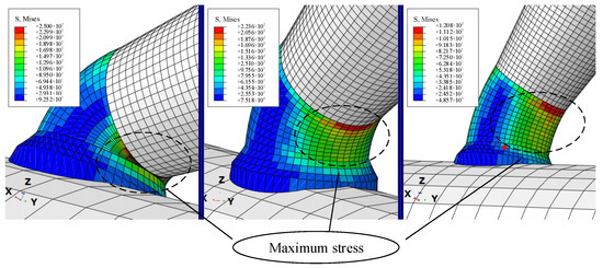 The capillary force is greatly affected by the volume and contact angle of the liquid bridge. From the simulation result curve shown in Figure 14, when picking up manipulation, when the contact angle is small (30°), the stress of the copper deposit is about 250 Mpa, which exceeds the tensile strength range of the copper deposit in the experiment, about 240 mpa, which leads to damage of the copper deposit, which affects the experimental effect. When the contact angle is large (60°), according to the simulation results, it can be seen that the maximum stress on the deposition site is about 120 Mpa. However, the capillary force increases with the volume of the liquid bridge and then decreases gradually as the volume increases, which leads to the increased complexity of the analysis during manipulation due to the consideration of changes in the capillary force. In contrast, when the volume of the liquid bridge is specific, the capillary pressure of the liquid bridge decreases with the increase of the contact angle. When the pipetting tube is perpendicular to the microcopper wire (90°), it is assumed that, in the pipette–liquid bridge, the liquid bridge substrate contact angle is equal (α1 = α3, α2 = α4), so the capillary force in the process of picking can be negligible. Although the stress of the deposited copper is relatively minimal, considering the release manipulation, because of orientation problems with the actual manipulation of the Microvision equipment, the liquid bridge volume, the deposition copper electrolysis time and other factors, we had to ensure that the pipette contact angle was not too large when manipulating in order to make the release manipulation successful and efficient.