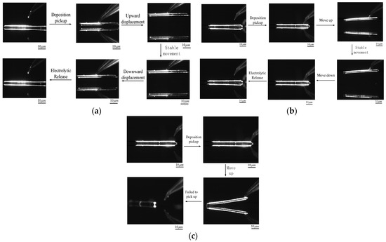 According to the experimental results in Figure 15, the following conclusions can be obtained: when the pipette filled with the electrolyte is located at the midpoint of the microcopper wire, the target can be firmly picked up and transferred to the designated position by deposition and then released. The average time of sediment during the whole process of picking up is about 190 s, the average time of electrolysis is about 360 s and the overall manipulating time is controlled within 10 min. When the pipette was positioned at four-fifths of the total length of the microcopper wire, Figure 15b shows that as the pipette moved upward during the pick-up process, the pipette could also achieve a good pick-up effect. Due to the adhesion effect, the adhesion force at the end picked up away from the deposition is significantly greater than the part near the deposited copper, resulting in a bending trend on one side of the microcopper wire during the pick-up process. There was apparent damage to the deposited copper.