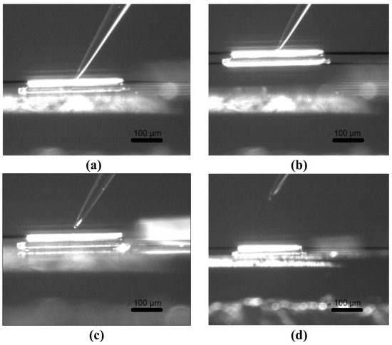 To verify the efficiency of the electrochemical micromanipulation method and the reliability of simulation results, the pipetting tube filled with an electrolyte was used to carry out the actual pick-up and release experimental verification of microcopper wire with a diameter of 15 μm and a length of 300 μm. The pipette tilt angle of the electrolyte-filled tube was set to between 45° and 60°. The average time to pick-up and release microcopper wires with a length of 300 μm was 182 s and 298 s, respectively, by the electrochemical principle. The microcopper wire was stable and lossless during the pick manipulation, and the electrolysis was entirely and pollution-free during the release manipulation. The pick-up and release experimental manipulation are shown in Figure 16.