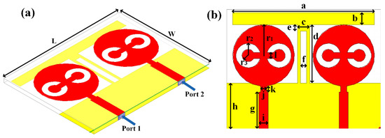 (a) Schematic of the split ring resonator loaded MIMO antenna. (b) The top (red) and bottom (yellow) layer structure is considered conductive copper material on FR4 substrate.