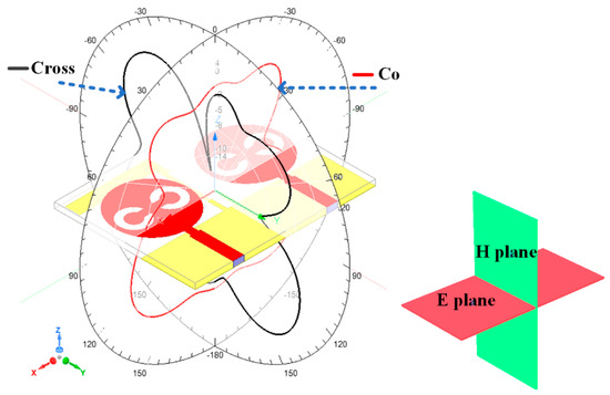 Representation of co−and cross−polarization plane to its axis system for design 4 antenna system with both port excitation conditions with E and H plane notation.