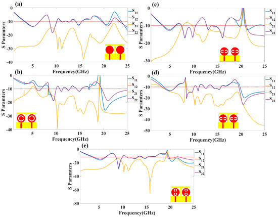 Calculated reflectance loss factors (S11, S12, S21, and S22) (in dB) for (a) design 1, (b) design 2, (c) design 3, (d) design 4, and (e) design 5 of the proposed structure of the antenna.