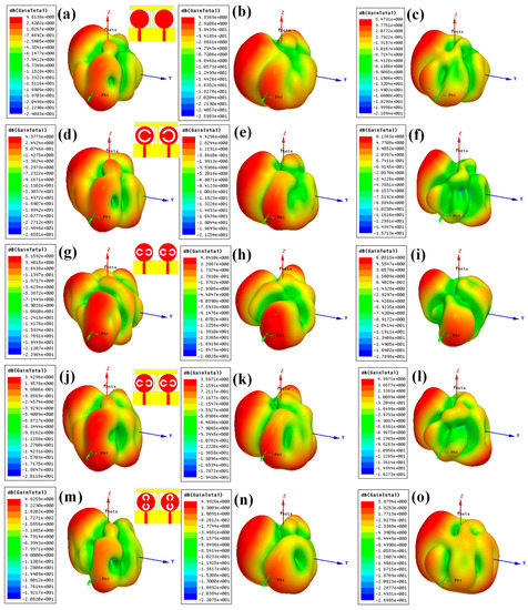 Variation in the radiation in 3D polar plots for the different port excitation conditions of (a–c) design 1, (d–f) design 2, (g–i) design 3, (j–l) design 4, and (m–o) design 5 antenna. The different port excitation conditions are (a,d,g,j,m) P1 = 0 and P2 = 1, (b,e,h,k,n) P1 = 1 and P2 = 0, and (c,f,i,l,o) P1 = 1 and P2 = 1.