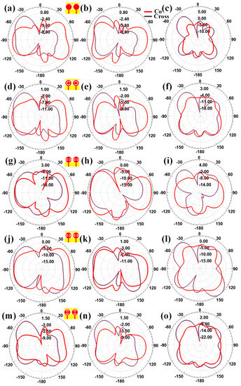 Variation in the radiation in 2D polar plots for the different port excitation conditions of (a–c) design 1, (d–f) design 2, (g–i) design 3, (j–l) design 4, and (m–o) design 5 antenna. The different port excitation conditions are (a,d,g,j,m) P1 = 0 and P2 = 1, (b,e,h,k,n) P1 = 1 and P2 = 0, and (c,f,i,l,o) P1 = 1 and P2 = 1.