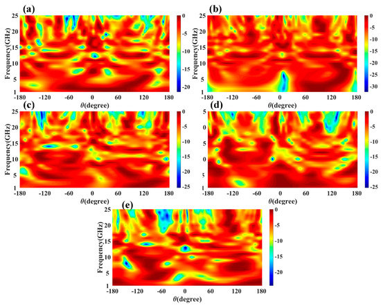 Calculated variation in normalized gain (dBi) for the different polar angles and frequency spectrums. Variation in gain for the different (a) design 1, (b) design 2, (c) design 3, (d) design 4, and (e) design 5 antennas.