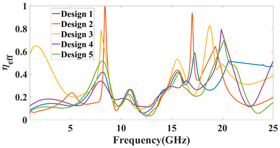 Variation in antenna radiation efficiency (measured) for different antenna designs.