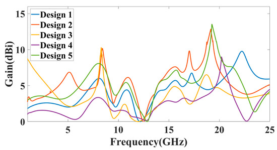 Figure 3c–e shows the return loss variation observed in design 3, design 4, and design 5. Figure 3a shows the return loss values for design 3. The six operating bands of 2.54 GHz, 0.29 GHz, 0.73 GHz, 3.94 GHz, 2.18 GHz, and 0.4 GHz are observed in a simulation study. The maximum band of the operation is 3.94 GHz for a frequency range of 12.75 to 16.69 GHz. The return loss observed in this band is −17.13 dB. Figure 3d shows the return loss values for design 4. The simulation study observed six operating bands of 2.46 GHz, 1.57 GHz, 0.51 GHz, 0.68 GHz, 1.73 GHz, and 5.18 GHz. The maximum band of the operation is 5.18 GHz for a frequency range of 19.82 to 25 GHz. The return loss observed in this band is −26.29 dB. Figure 3e shows the return loss values for design 5. The four operating bands of 3.42 GHz, 1.66 GHz, 6.55 GHz, and 5.28 GHz from the simulation study are observed. The maximum band of the operation is 5.28 GHz for a frequency range of 19.22 to 25 GHz. The return loss observed in this band is −20.84 dB. The overall minimum return loss of −29.33 dB is observed in the second band of 8.45 to 10.11 GHz frequency band. In Figure 2 of the S parameters’ values of the antenna, the response of the S12 is overlapped with the parameter S21. The reason for overlapping both responses is the ideally mirrored image on both sides of the antenna over the center axis.