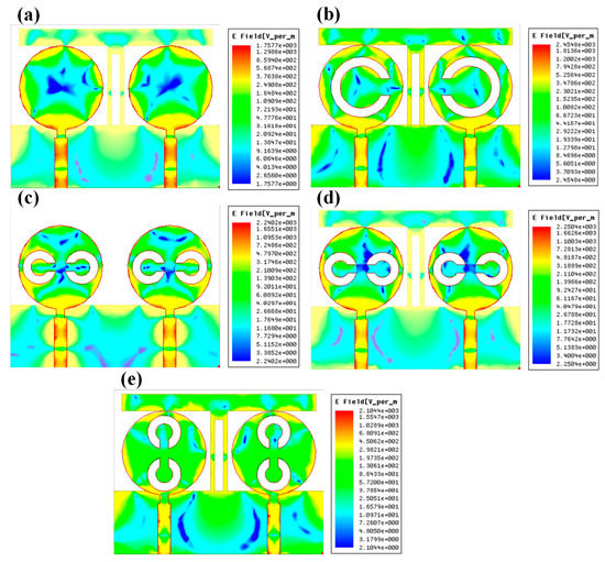 Normalized electric field distribution for the different shapes of the structures. The normalized electric field intensity for the different antenna designs (a) Design 1, (b) Design 2, (c) Design 3, (d) Design 4, and (e) Design 5 for the 10 GHz frequency value.