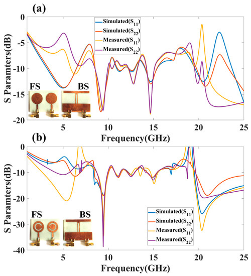 Comparative plot of simulated and measured reflectance loss factors (S11, S22) (in dB) for (a) design 1 and (b) design 2 of the proposed structure of the antenna.