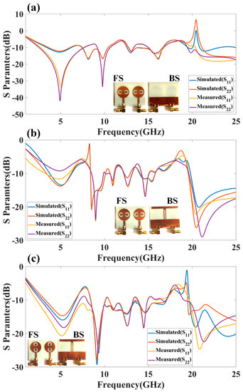Comparative plot of simulation and measured reflectance loss factors (S11, S22) (in dB) for (a) design 3, (b) design 4, and (c) design 5 of the proposed structure of the antenna.