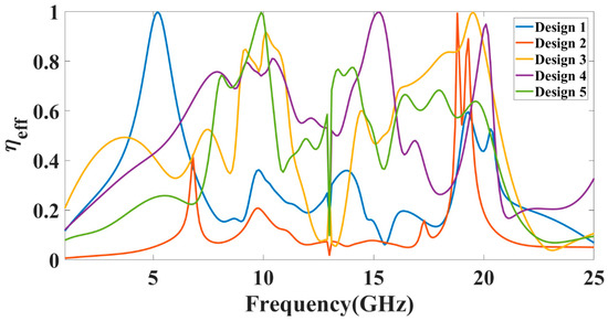 We also calculated the variation in directivity for the entire frequency spectrum band, and the results are shown in Figure 6. Figure 6 shows the change in normalized directivity (dB) for the angle values of −180° to 180° and phi of radiation pattern 0 degrees for the entire frequency spectrum of 1 to 25 GHz. We can also identify the values of the >−3 dB operating band for the specific radiation rather subgraph and its suitable frequency bands. Figure 7 shows the radiation efficiency of the different antenna designs over the entire frequency band of the operation. The variation in frequency excitation from 1 to 25 GHz values of this process gives us the efficiency values of the spectrum bands. The maximum radiation efficiency peak shows near the 8 GHz and 18 GHz frequency points. Comparing the return loss values and gain plot, these two points do not show the practical return loss values. In other bands of the operation, as shown in Figure 3, the average radiation efficiency is observed at > 40% for most bands. Therefore, we can choose the effective radiation efficiency, return loss values, gain, and directivity values to identify the effective operation of the MIMO antenna. The radiation efficiency allows for identifying the broad operating frequency band where the antenna radiated to its higher amplitude of electromagnetic radiation. The combined results of the return loss and efficiency allow for choosing the type of design, operating frequency spectrum, and radiation bandwidth.