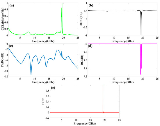 Variation in different MIMO antenna parameters (a) CCL, (b) MEG, (c) TARC, (d) DG, and (e) ECC for the design 4 antenna structure.