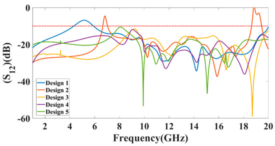 Comparative plot of measured cross-port reflection values (S12) for the different antenna designs.