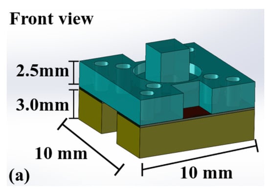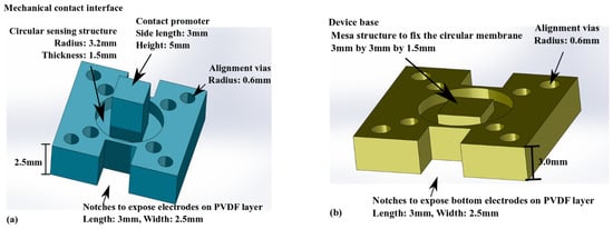 The two designs in Figure 2 for 3D printing have two common characteristics. Alignment vias are used to accurately position each layer on top of the others during the assembly process, to form the device shown in Figure 1. The notches help to expose the electrodes on the PVDF thin films for external interconnects. As for the differences in the two designs, the 3D printed top elastic layer in Figure 2a features a 3 mm-by-3 mm-by-5 mm contact promoter (as the active palpation area) at its center. Around the promoter is a circular region with a radius of 3.2 mm and a thickness of 1.5 mm. The rest of the top elastic layer has a 2.5 mm thickness to minimize the risk of curling during 3D printing. Figure 2b shows a 3 mm-by-3 mm square mesa with a thickness of 1.5 mm at the center of the base. This square mesa provides a protective fixed constraint. Palpation procedures can lead to large deformations, reaching a few hundred micrometers [,]. The mesa in the device base layer has the role of minimizing the risk of structural damage.