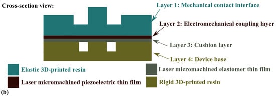 Secondly, the decomposition temperature of the polymers is usually significantly lower than that of silicon or metallic materials. Therefore, it becomes possible to use some serial processing methods to directly shape the microstructures into thin polymer films at an acceptable speed. Two representative examples of such manufacturing techniques are electrical discharge micromachining (EDM) [] and laser micromachining []. When these two processes are used to make polymer MEMS devices from polymer thin films, there are no extra material deposition and masking lithography steps, further reducing the process’s complexity. These advantages are the primary motivation for using the laser micromachining technique to fabricate the electromechanical coupling layer and the cushion layer in Figure 1b.