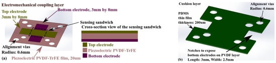 Similar to the structural parts in Figure 2, the two components in Figure 3 have corresponding alignment vias. As shown in Figure 3a, the mechano-electrical coupling of the tactile sensor is achieved by using a 20 µm-thick piezoelectric PVDF-TrFE film. This material has higher thermal stability than pure PVDF polymer []. Two electrode layers deposited (by screen printing) on the bottom and top surfaces of the piezoelectric film overlap the center area to create a 3 mm-by-3 mm sensing structure. The PDMS cushion layer in Figure 3b separates the PVDF-TrFE layer from the device base, minimizing the risk of cracking the piezoelectric layer during an operation.