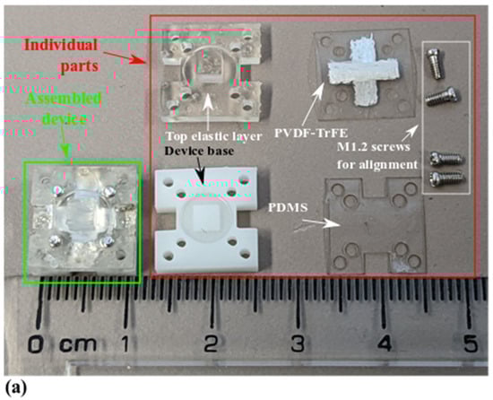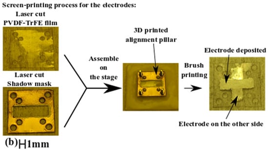 In Figure 4a, the individual parts (in the red frame) are assembled into the piezoelectric tactile sensor (in the green frame) based on a sequence of steps. Firstly, the PVDF-TrFE layer is combined with the PDMS layer through roll-to-roll adhesive lamination, using 25 wt% polypropylene carbonate (PPC)/acetone solution as an adhesive. Then, the screws in Figure 4a are partially pushed into the device base from the bottom side to form alignment pillars. After applying the PPC solution onto the device base and the bottom surface of the top elastic layer, the PVDF/PDMS composite is aligned with the four screws and placed on the device base. The top elastic layer is placed onto the device base afterward. As the last step, the screws are fully pushed into the device base. Figure 4b shows the details of how shadow masks are used to create electrodes during the screen-printing process. This electrode fabrication process differs from the authors’ previous work [], where the E-beam evaporation of thin aluminum films was used. It shows that the manufacturing process previously developed by the authors has a level of flexibility by allowing alternative techniques for some of the fabrication steps.