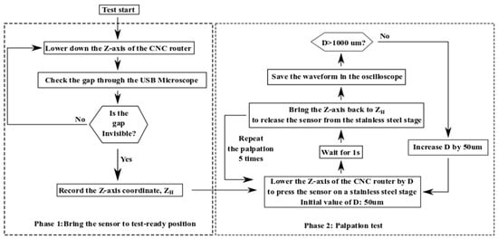 The pressing depth during palpation is one of the two primary factors affecting the output of a tactile sensor. For the sensor fabricated in Section 2, its sensitivity to the pressing depth has been tested using the procedure illustrated in Figure 6.
