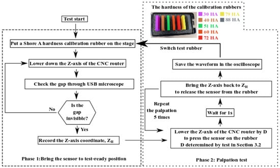 The test in Figure 7 conducts palpations on a set of elastic rubbers used for Shore A hardness calibration to evaluate the tactile sensor’s sensitivity to material hardness. With the hardness increasing from 30 HA to 88 HA, these rubbers are similar to human tissues in their mechanical hardness []. During the test in Figure 7, the vertical position of the sensor is optimized whenever the rubber is switched. The initial vertical position, ZH, is kept the same for the palpations on the same rubber. The palpations during Phase 2 are conducted five times at a single location for each piece of rubber. The pressing depth, D, is determined by the test in Section 3.2. D is kept the same throughout the whole test process in Figure 7. The average value of the five consecutive measurements is based on the tactile sensor’s readout voltage corresponding to the rubber’s hardness.