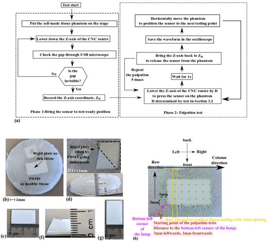 Method to test the piezoelectric tactile sensor effectiveness in palpation-based detection of buried rigid objects. (a) The flowchart of the method; (b) The top side of the self-made tissue phantom; (c) The bottom side of the phantom; (d) The thickness of the phantom; (e–g) The length, thickness, and width of the rigid plate as a hard tissue volume; (h) Map of the measurement locations.