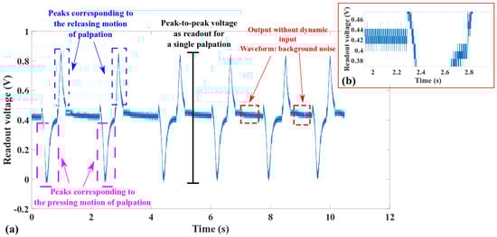 Similar to the readout of other piezoelectric tactile sensors [], the waveform in Figure 9a reflects the strengths and weaknesses of piezoelectric sensing. The piezoelectric effect is not suitable for static measurements. Instead, it works well in sensing the time-domain dynamics of an input excitation. This is why the output voltage in Figure 9a shows only background noise when the tactile sensor is above the target surface or pressed statically against the target surface. Similarly, peaks with a 180-degree phase difference appear in pairs during the motions to press or lift the piezoelectric tactile sensor. These peaks disappear when the motions of pressing or releasing end. In Figure 9a, the DC offset is around 0.9 V, indicating that the tactile sensor has already been pressed against the target surface before the palpation cycles leading to the voltage peaks in Figure 9a are conducted. To minimize the impact of such experimental conditions on the evaluation of the tactile sensor’s performance, this paper considers the voltage difference between the peak corresponding to the pressing and the peak corresponding to releasing as the readout for a single palpation. Figure 9b shows a zoom-in view of the static background noise with a peak-to-peak amplitude of around 40 mV. In addition to the intrinsic electrical noise of the readout electronics, other sources of noise are due to the DC power supply and the non-shielded interconnected wires.