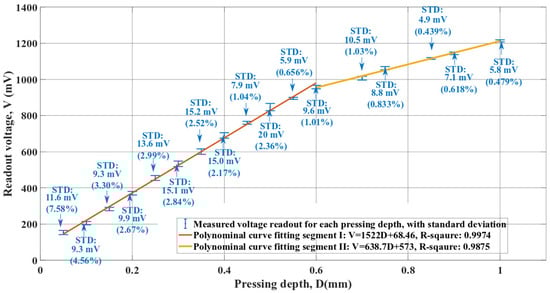In Figure 10, the maximum standard deviation of the measured voltage readout is around 7.5%. The corresponding pressing depth is 50 µm. For other pressing depth values, the standard deviations are below 5%. Based on the testing flow shown in Figure 6 of Section 3.2, the minor standard deviation in Figure 10 indicates that the tactile sensor has a relatively consistent response to the same conditions during repeated operations. In addition, the lower and upper limits of the neighboring voltage readouts do not overlap in Figure 10. This observed result demonstrates that the fabricated tactile sensor can detect a pressing depth difference of around 50 µm.