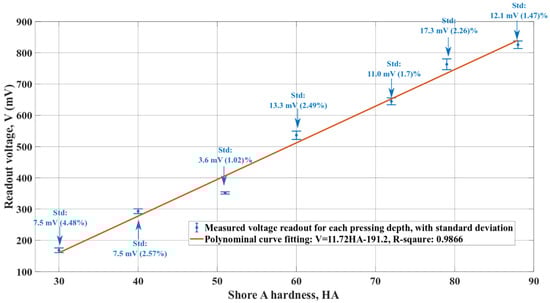 In Figure 11, the voltage readout dependence on the hardness scale can be fitted on a first-order polynomial with a good correlation coefficient. The slope of the fitted curve, 11.72 mV/HA, represents the tactile sensor’s sensitivity to the hardness of the palpation target for a fixed palpation depth of 500 µm. The fitted curve in Figure 11 has a non-zero voltage output when the material hardness is zero, which could be related to the vertical re-positioning of the tactile sensor during Phase 1 in Figure 7.