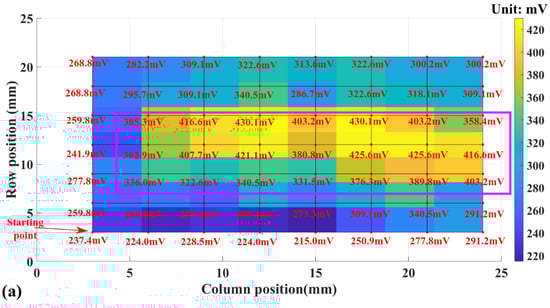 The red dots in Figure 12 correspond to the grid points represented by the green crosses in Figure 8h. The voltage readout for each red dot is labeled in Figure 12a. Since all the readouts are within the range in Figure 11, it becomes suitable to analyze them using the fitted curve in Figure 11. In Figure 12a, the output voltage values at the PDMS surface locations above the buried rigid plate in Figure 8h are circled out by the pink rectangle. The readouts within the pink rectangle have an average value of 388.91 mV, with a standard deviation of 34.85 mV. This average value corresponds to a Shore A hardness of 49.49 HA. For the voltage readouts on the PDMS surface with no rigid lump buried underneath, their average value is 282.76 mV, with a standard deviation of 34.02 mV. This average value corresponds to a Shore A hardness of 40.44 HA. The average difference in the detected material hardness within and outside the pink rectangle is around 9 HA.