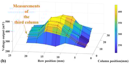 In Figure 13a, the voltage readouts follow a trend similar to the one for the third column in Figure 12b (circled in orange dashed lines). The difference between the voltage readouts in Figure 12b and Figure 13a could be related to the limited accuracy in the vertical re-positioning of the tactile sensor. In Figure 13a, the non-uniform influence of the tilted rigid plate buried in the PDMS on the equivalent hardness and the voltage outputs is still observable. As shown in the left part of Figure 13a, the upwardly tilted side is closer to the PDMS surface, leading to a more significant increment to the equivalent hardness. Hence, this upwardly tilted side can be detected more sharply from the voltage readouts. On the contrary, the increment in the equivalent hardness related to the downwardly tilted side is more limited. Consequently, the voltage readout corresponding to the border on this side has a smaller difference from the voltage readout corresponding to the surrounding PDMS, as shown in the right part of Figure 13a.