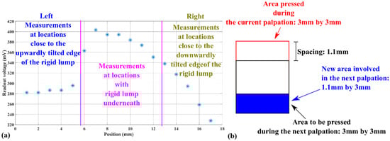In addition, as mentioned in Section 3.4, the second series of palpation along the third column used 17 testing points with a spacing between neighboring points of around 1.1 mm. As shown in Figure 13b, due to this setup, only a 1.1 mm-by-3 mm new area was involved in each palpation test. Hence, the gradually decreasing voltage readouts in the right part of Figure 13a suggest that the tactile sensor can detect hardness differences within an area smaller than the area of its contact promoter.
