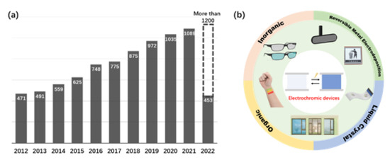 As shown in Figure 1b, with the advancement of research, ECDs have been applied in more fields in recent years (such as anti–glare rear–view mirrors for automobiles, paper–like electronic devices for eye–friendly and low energy consumption displays, etc.) [3,4,5,6], demonstrating the greater potential application. Conventional ECDs usually have a multilayer structure, including an electrochromic functional layer, an ion storage layer for charge balancing, an ion transport layer, and conductive electrodes on both sides [7,8,9]. As we all know, the operation of the ECD depends on the corresponding redox reaction of the functional layer under the action of an external voltage. Moreover, the temperature will play a very important influence on this electrochemical reaction. In practical applications, the temperature also affects many properties of the device [10].