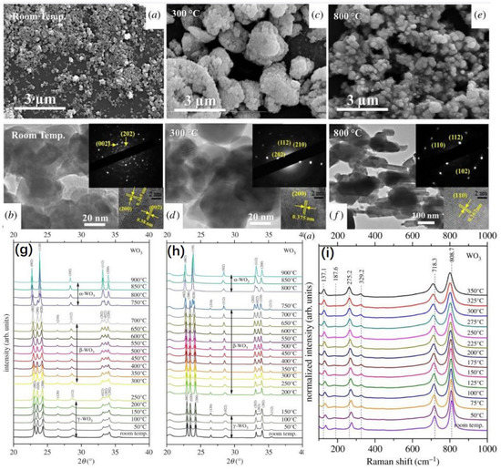 (a–f) show SEM and HRTEM images of the WO3 nanoparticles after treatment at various temperatures. The in situ XRD during (g) heating and (h) cooling and (i) in situ Raman spectroscopy of WO3 in different temperatures. Reprinted with permission from Ref. [130]. Copyright 2018, Royal Society Open Science. More details on “Copyright and Licensing” are available via the following link: https://www.mdpi.com/ethics#10.