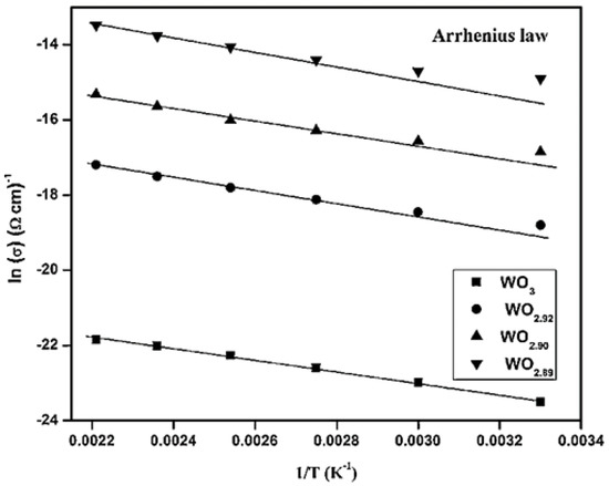 Arrhenius plot of ln(σ) versus 1/T for WO3, WO2.92, WO2.90, and WO2.89 thin films. Reprinted with permission from Ref. [142]. Copyright 2016, Elsevier. More details on “Copyright and Licensing” are available via the following link: https://www.mdpi.com/ethics#10.