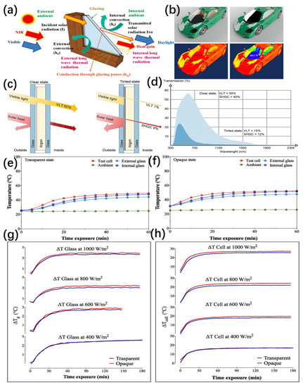 (a) schematic of a conventional window showing heat loss, heat gain and daylighting penetration. Reprinted with permission from Ref. [69]. Copyright 2021, Elsevier. More details on “Copyright and Licensing” are available via the following link: https://www.mdpi.com/ethics#10. (b) Simulation of infrared reflection effect of vehicle electrochromic glass based on RME device, (c) electrochromic glazing control states and (d) spectral transmission of electrochromic glass in different tint states. Reprinted with permission from Ref. [151]. Copyright 2018, Elsevier. More details on “Copyright and Licensing” are available via the following link: https://www.mdpi.com/ethics#10.The measured temperature of external and internal glazing surface, test cell and ambient environment in the (e) translucent state and (f) transparent state under 1000 W/m2 of PDLC. (g) the time variation of the temperature difference (ΔTg) between the internal and external across all various s radiation intensities. (h) the time variation of the temperature difference (ΔTcell) between the internal cell temperature and external ambient across all various radiation intensities. Reprinted with permission from Ref. [66]. Copyright 2020, Elsevier. More details on “Copyright and Licensing” are available via the following link: https://www.mdpi.com/ethics#10.