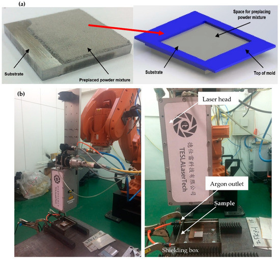 (a) Setup used to preplace the Fe-based amorphous powder, (b) laser cladding setup used.