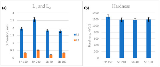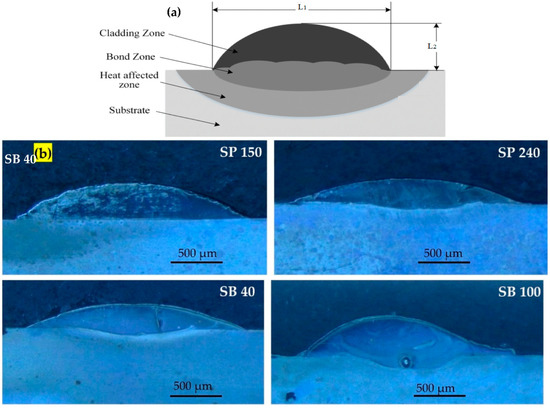Figure 2a shows a schematic for the cross-section of laser-cladded single track illustrating the relevant dimensions, the height of the track (L1), and the track width (L2). Figure 2b shows the laser-cladded samples, each original sample presenting different surface roughness. As it can be seen in Figure 2, the surface roughness of the substrate obtained by SP or SB processes has affected the geometry and the hardness of the single-cladded tracks of Fe-based MG. The results are presented in Table 2 and illustrated graphically in Figure 3.