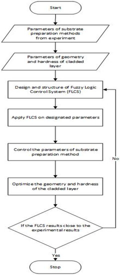 A fuzzy logic control system (FLCS) was used to predict which substrate surface preparation technique would optimize the geometry and hardness of the developed Fe-based MG single tracks. The flow chart of the FLCS used is shown in Figure 4.