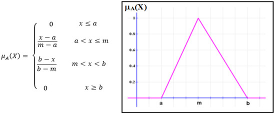 Fuzzy logic is used to characterize fuzziness. The membership function represents the best way to describe this fuzziness, as it expresses the degree of truth. For a fuzzy set (A), (X) can be expressed as µA:X → [0, 1], meaning the values of (X) are constrained within 0 and 1. The universe of discourse and degree of membership appear in the (x) axis and (y), respectively. The letters a and b represent the lower and upper limits of the triangular membership function, as shown in Figure 7 [43].