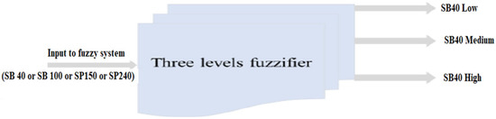 Fuzzification in fuzzy is performed by converting a new quantity of inputs into a fuzzy quantity by identifying the deterministic quantities as completely nondeterministic. The triangular membership function used to fuzzify each input to the designed fuzzy system into three fuzzy values (low, medium, and high) are shown in Figure 8. Triangular membership functions for the fuzzy system inputs (SB40, SB100, SP150, SP240) are shown in Figure 9a–d, respectively. Table 3 explains the range of fuzzy system inputs (sandblast and sandpaper) with three levels: low, medium, and high.