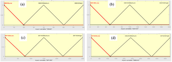Triangular membership functions for fuzzy system inputs (a) SB 40, (b) SB 100, (c) SP 150, and (d) SP 240.