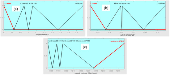 The triangular membership function is used in the defuzzification process for the fuzzy outputs with low, medium, and high levels to get geometry L1 and L2 (Figure 11a,b, respectively) and hardness (Figure 11c) of Fe-based MG, corresponding to the substrate surface preparation method (sandblast and sandpaper polishing). Levels of fuzzy system output are presented in Table 4.