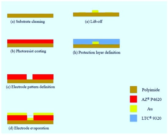 The sensing area of the flexible micro air velocity sensor is 400 µm × 400 µm. The line width and spacing of the sensor are 15 µm. The design and mask layouts are shown in Figure 2. The flowchart is shown in Figure 3. Surface micromachining technology was used in the manufacturing process, including coating (Figure 4a), exposure (Figure 4b), development, and lift-off (Figure 4c). The optical micrograph and stereogram of the finished flexible micro air velocity sensor are shown in Figure 4d,e.